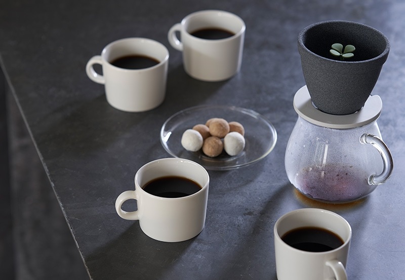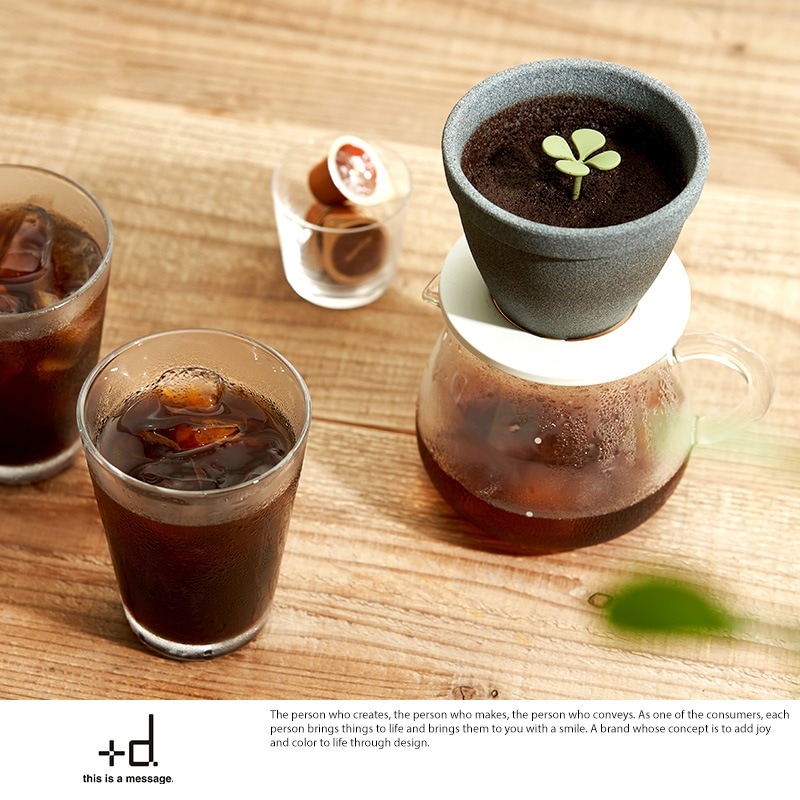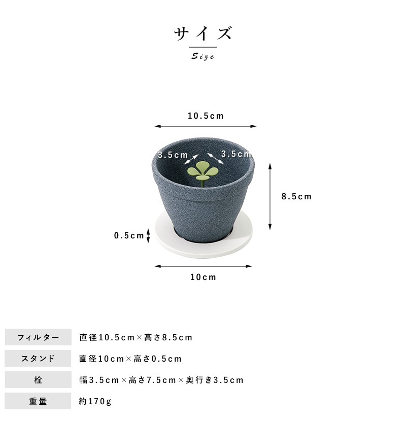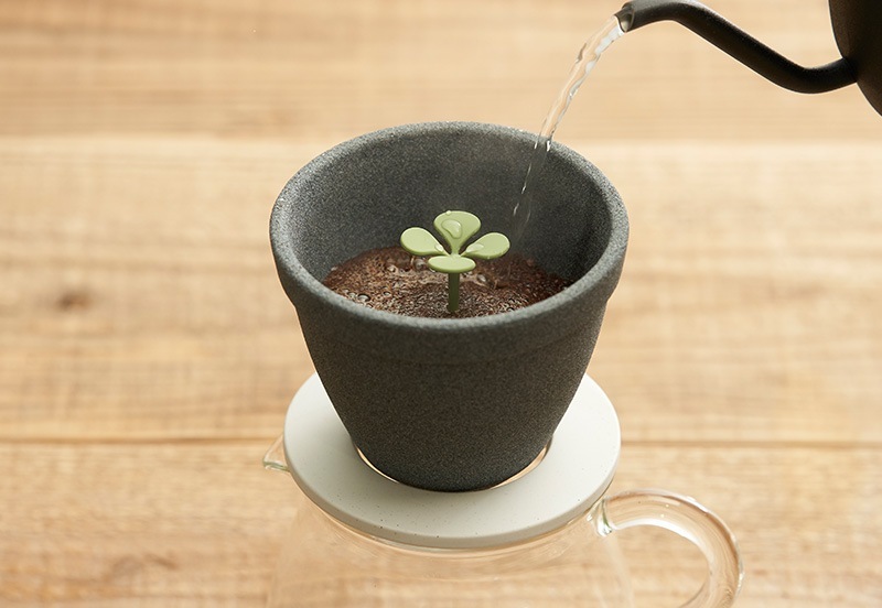 新芽に水をあげるようにコーヒーを淹れるセラミックフィルター。植木鉢のようなフィルターから生えている芽の目盛りは、適切なコーヒー豆と湯量の目安にもなっています。セラミックの多孔質構造により雑味を除去し、コーヒーの澄んだ美味しさ、まろやかな口当たりを楽しめます。紙フィルターを使用せず繰り返し使えるので、ゴミが削減でき、環境にやさしく経済的です。底側から芽を押し出せば、フィルターを流水で洗えます。長崎・波佐見の地で日々研究を重ねて育まれた技術で、工程のほとんどが職人の手仕事によって作られています。バリスタ協力のもとフィルターの形状にこだわり、本格的なコーヒーの味わいを目指したフィルターです。