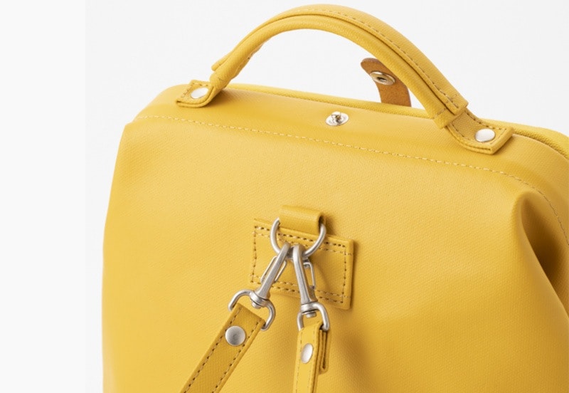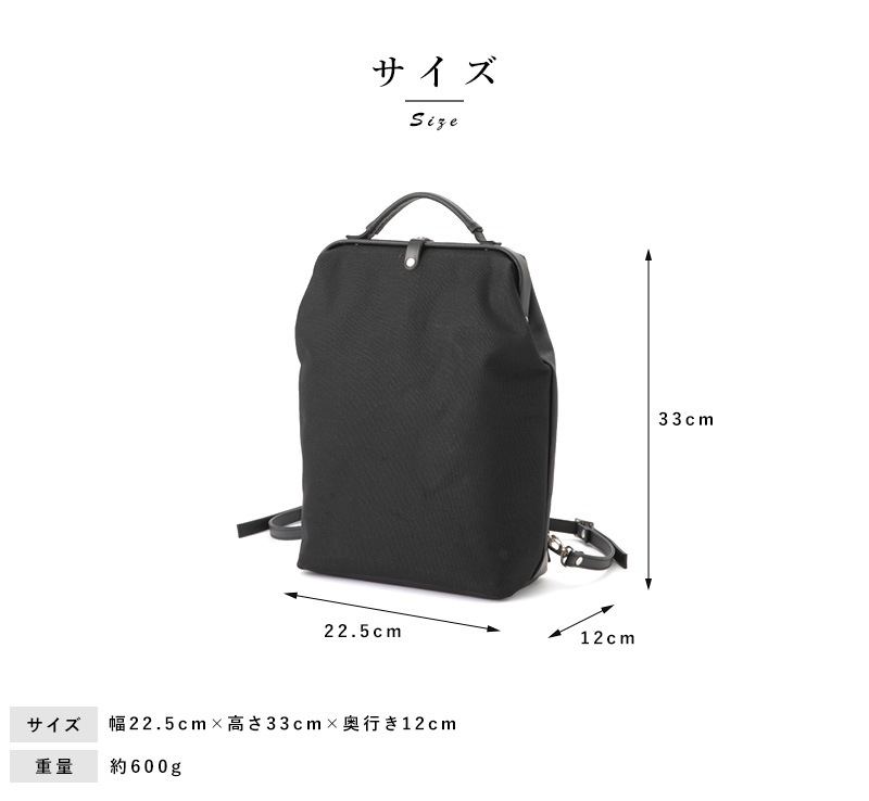 医者のかばんをモチーフにしたリュック。特徴的な口金入りのバッグ口はそのままに、A4サイズの書類が縦に収まる縦型のシルエット。底板入りで型くずれしにくく、すっきりとした印象です。生地は片面をPVCコーティングした8号帆布を使用し、防水機能と自然な風合いを兼備。バッグの正面は帆布らしいマットな風合い。背面はつるりとした手ざわりのPVC面を使用しており、洋服への色移りや傷みを予防します。身体にフィットした状態で身につけられるよう、背負いベルトは上下とも多方向に動くナスカン付き。バッグの内側には財布やスマートフォンが入るオープンポケットが付いています。