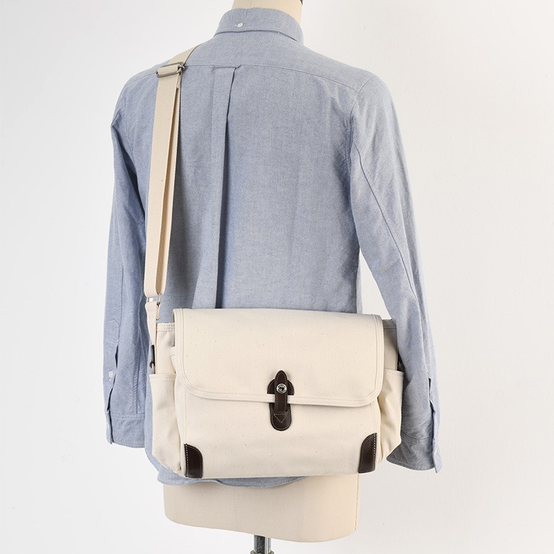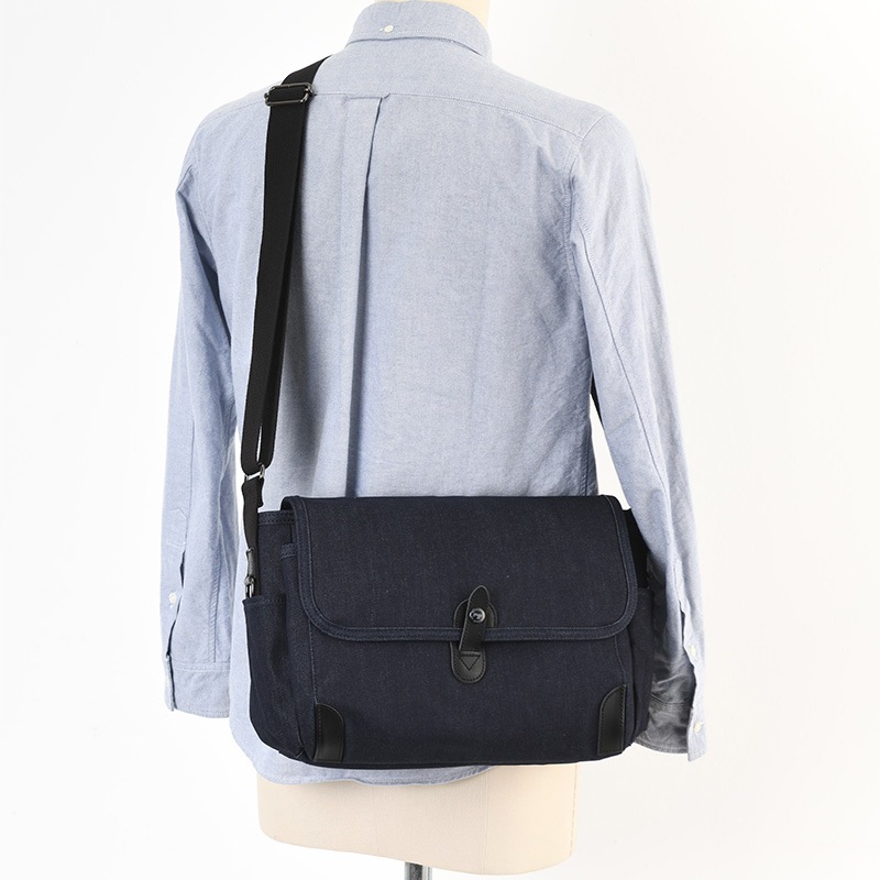オーガニックコットンを使用した、豊岡鞄認定のショルダーバッグ。オーガニックコットンの国際認証である“GOTS”の認証を経て、国産デニムの一大産地である岡山県にて仕立てた生地を使用しています。小物の整理整頓に便利なフラップ下オーガナイザーや、スマホやパスケースなどの収納に適した背面ポケットを装備。さらに左側面にDカン、右側面にフックが付いているので、鍵などを取り付けてポケットに収納できます。ちょっとした外出や旅行時のサブバッグなどに便利なショルダーバッグです。