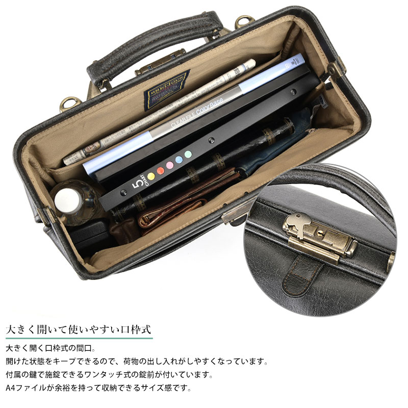 ・メイン収納の開閉は大きく開く口枠式を採用。開けた状態をキープできるので荷物の出し入れがしやすくなっています。