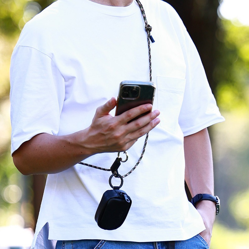 バッグの中で行方不明になりがちなワイヤレスイヤホンも、このポーチに入れておけばリングカラビナでバッグの持ち手やベルトのDカンなどにぶら下げておけるので、すぐに出し入れができます。